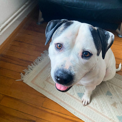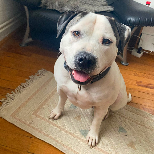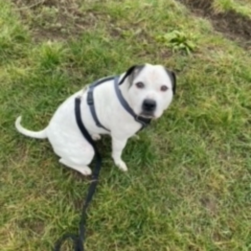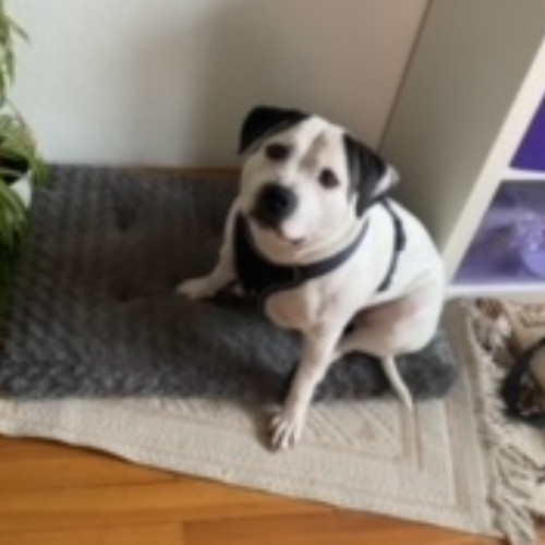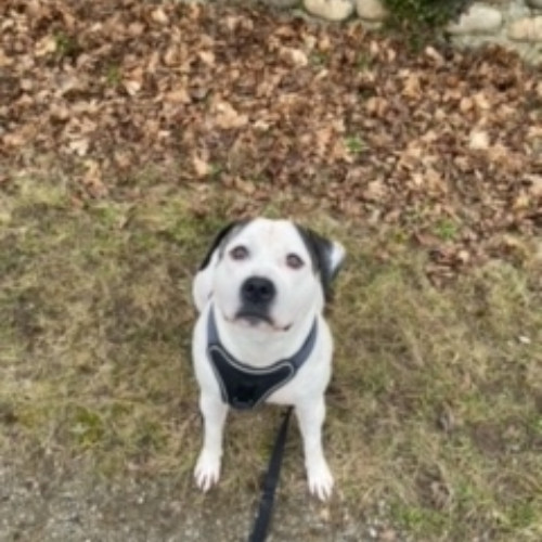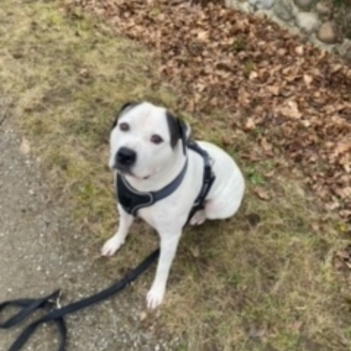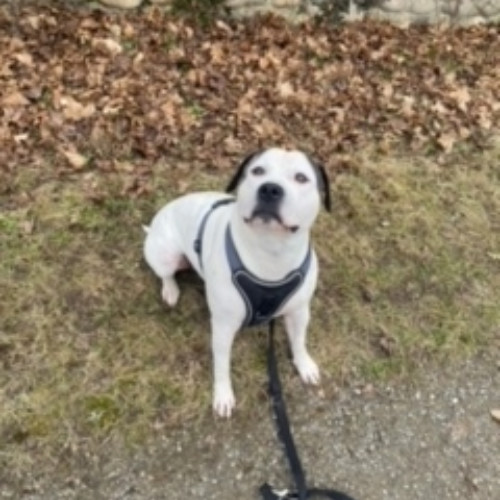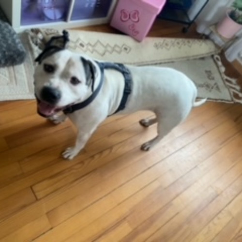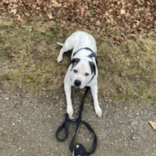 ist eine American Bully Mischlingsdame, weiß mit schwarzen Öhrchen, sie ist 2 Jahre alt und ausgesprochen lieb und freundlich.